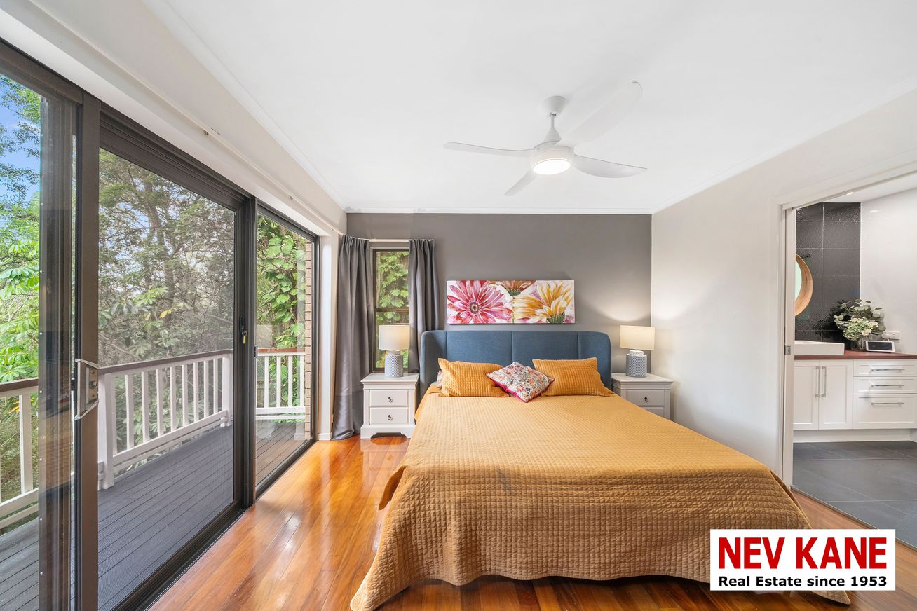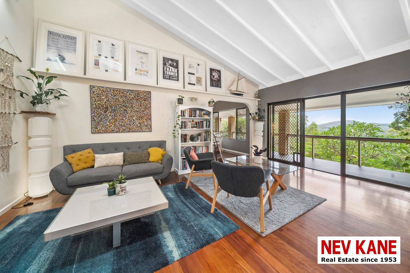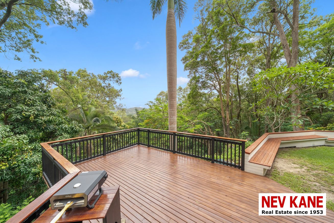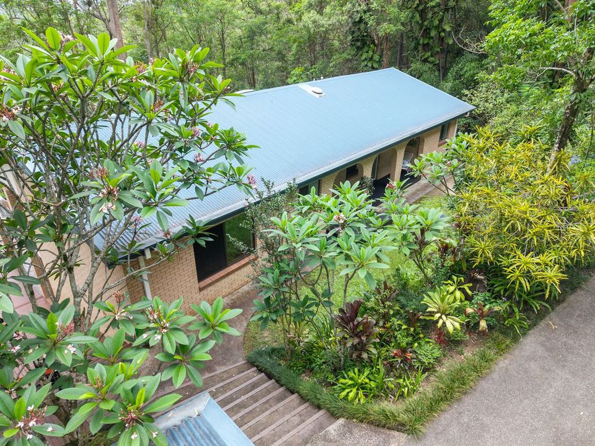 This private, secluded 1.36-hectare (3.3-acre) property offers a lush rainforest vibe with stunning northern views. Perched high on a hill above Nambour, this 5-bedroom plus study, 3-bath home is truly a “home among the gum trees,” complete with resident rock wallabies and a seasonal creek.